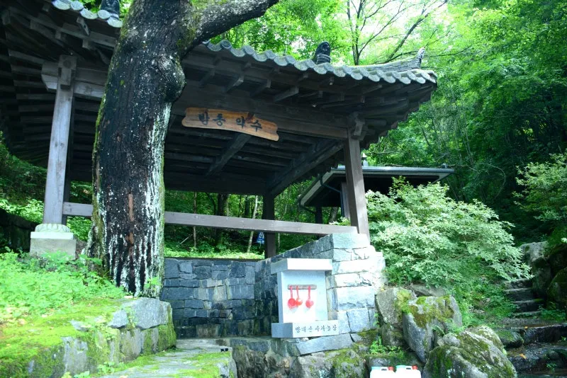 깊이 패인 암석 사이에서 나오는 무색투명한 광천수의 방동약수는
