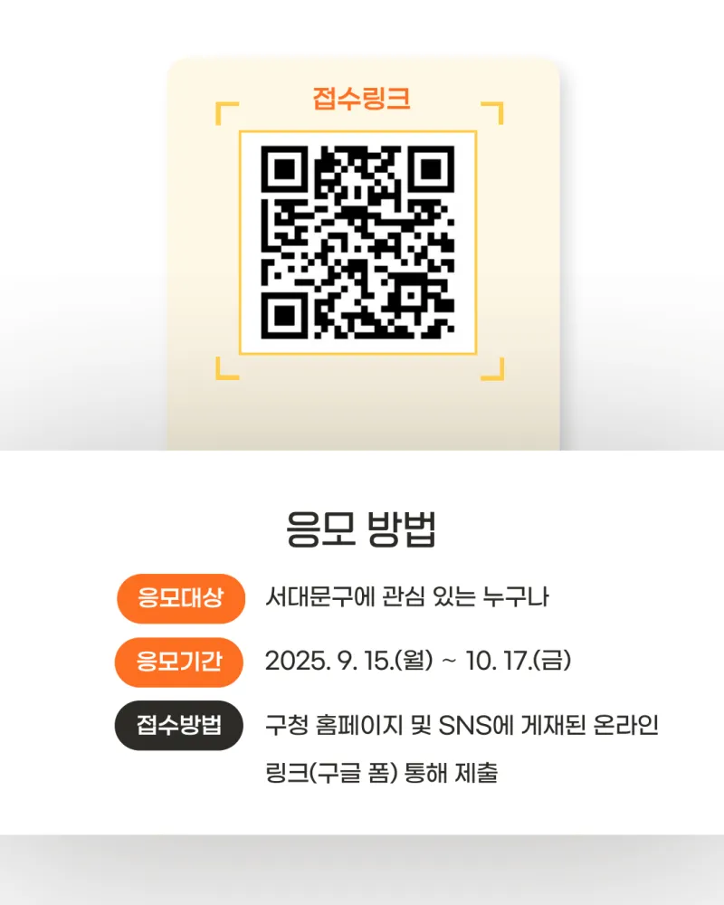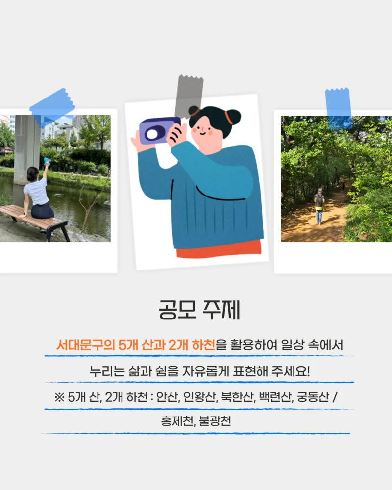 2025년 서대문구 SNS 콘텐츠 공모전 📌공모기간: 2025. 9. 15.(월)~10. 17.(금) 📌공모주제: 서대문구의 5개 산과 2개 하천을 활용하여 일상 속에서 누리는 삶과 쉼을 자유롭게 표현 ※ 5개 산, 2개 하천 : 안산, 인왕산, 북한산, 백련산, 궁동산 / 홍제천, 불광천 📌응모자격: 서대문구에 관심 있는 누구나 - 개인 또는 단체(팀)별 1개 작품 제출 📌공모부문 -📹영상(숏폼): 20초 이상 60초 미만 -📸사진: 이미지 5장 이내+스토리 🗂️ 응모방법 : 하단의 필수서류와 함께 구글폼으로 공모작 ...