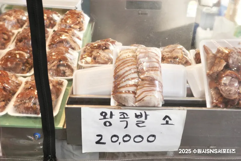 시장 안쪽으로 이어진 길에서 가장 흔히 볼 수 있는 음식은 족발이었습니다. 대게 족발 + 순대 조합으로 즐길 수 있는 곳이 많습니다. (족발의 고소하고 부드러운 식감에 순대의 담백함! 그 조화가 좋습니다.) 그런 수원의 독특한 음식 문화를 경험할 수 있는 장소인데요!!