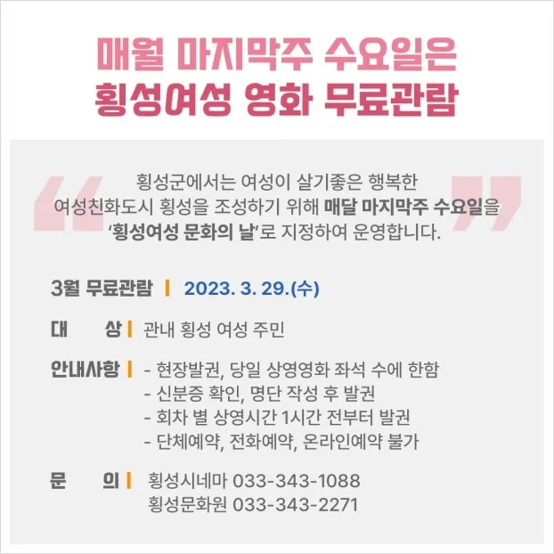 [횡성여성 문화의 날] 매월 마지막주 수요일 횡성여성 무료관람