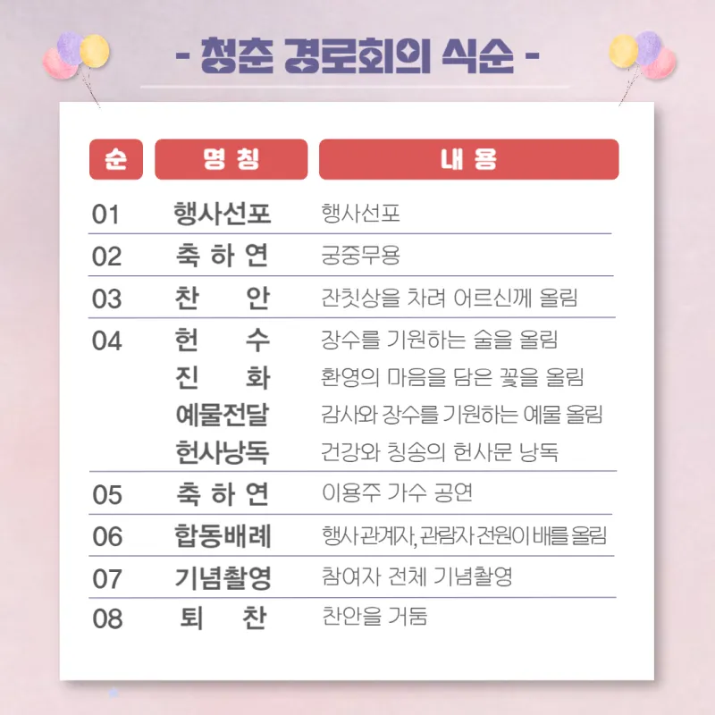 찬안, 헌수, 진화, 예물전달, 헌사낭독, 축하연, 합동배례 순으로