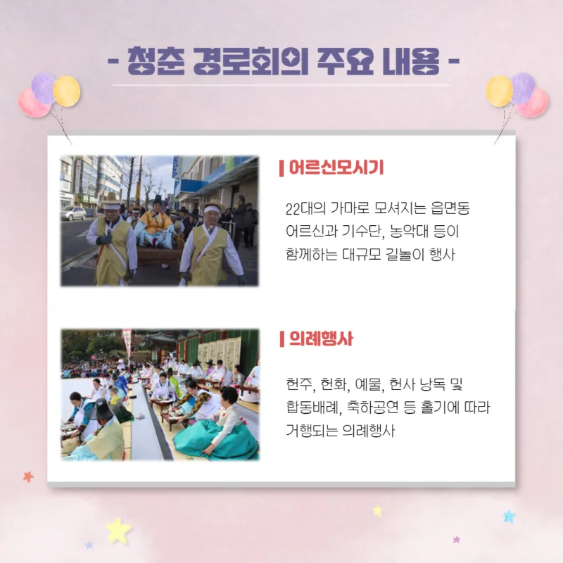 신분의 고하를 초월하여 75세 이상 되신 어른을 모두 모시는 경로 축제