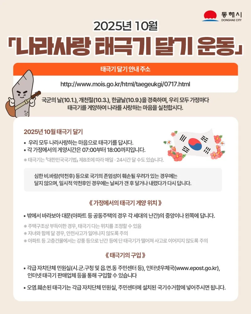 국군의 날(10.1.), 개천절(10.3.), 한글날(10.9.)을 경축하며, 우리 모두 가정마다 태극기를 게양하여 나라를 사랑하는 마음을 실천합시다.