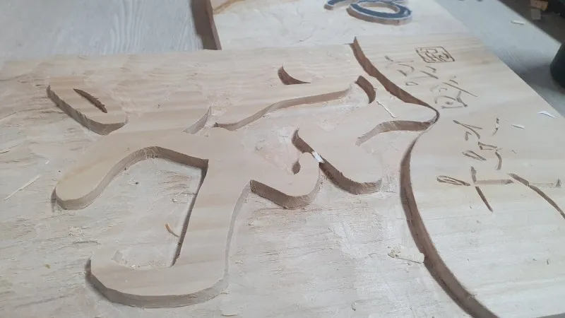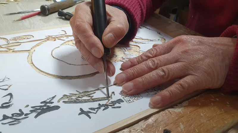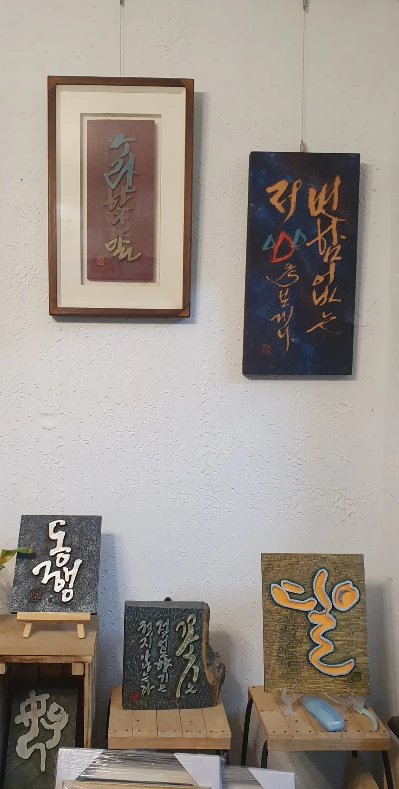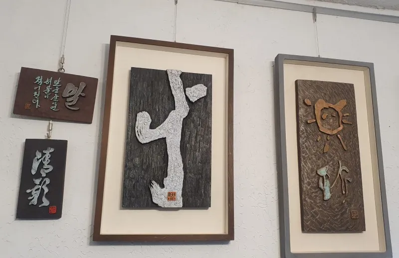 먼저 종이에 글씨를 써서 붙입니다. 그것을 '서고'라고 하고 사포질을 하지 않고 끌로 파서 다양한 도구들로 양각과 음각을 표현해서 제작하게 됩니다. 마지막으로 아크릴 물감을 이용해 채색하는 과정을 거치면 작품이 완성됩니다.
