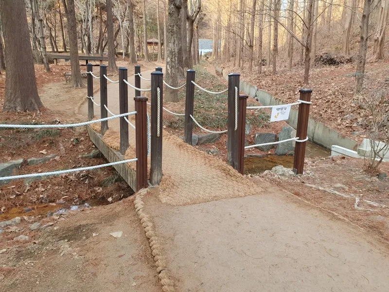 식장산에서 내려오는 시냇물이 흐르는 곳에 있는 작은 나무다리 위에는 아자 매트를 깔았고, 다리를 지나면 다시 황톳길이 이어집니다.