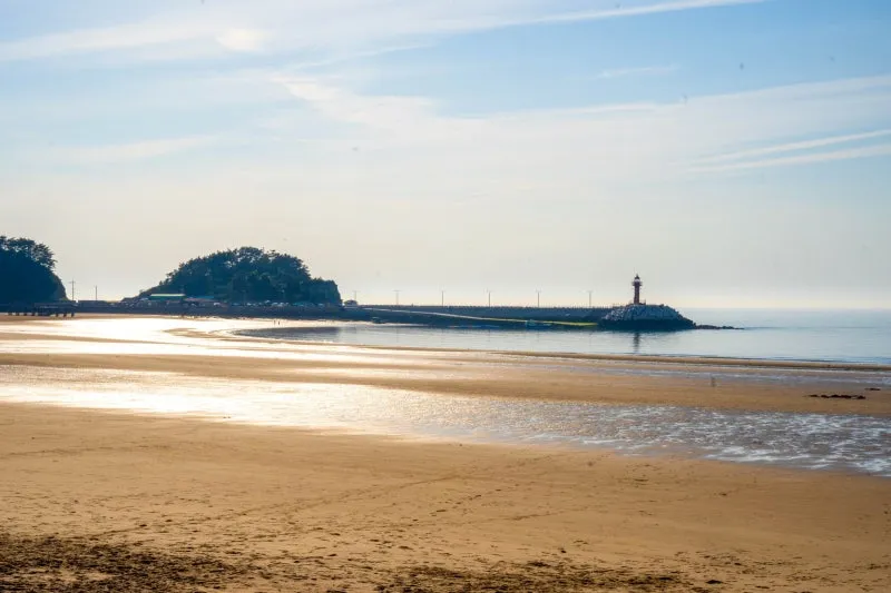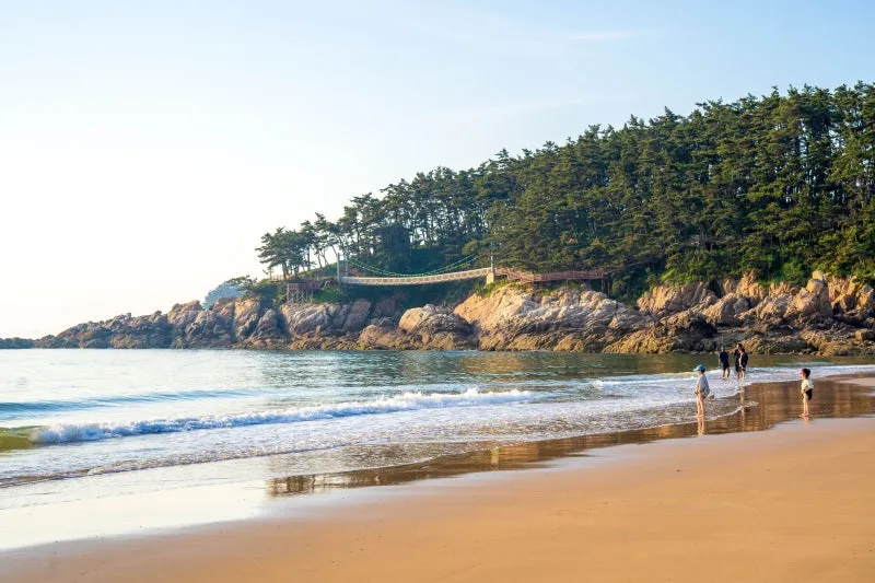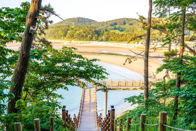태안 만리포해수욕장의 넓고 아름다운 백사장을 거닐다 어느새 해변 끝자락에 다다르면 만날 수 있는 근처 여행 코스는 울창한 소나무로 뒤덮인 아름다운 뭍닭섬에 닿을 수 있는데 푸른 만리포 해안을 따라 산책로가 이어집니다.