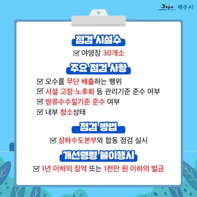 ✔ 오수를 무단 배출하는 행위 ✔ 시설 고장·노후화 등 관리기준 준수 여부 ✔ 방류수수질기준 준수 여부 ✔ 내부 청소상태 |