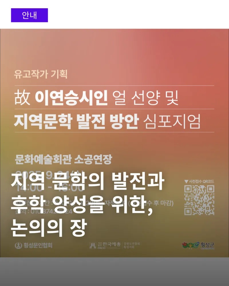 #횡성문인협회 #얼선양사업 #지역문학심포지엄 #이연승 #아동문학 #지역문학 #문화예술회관 #사전접수