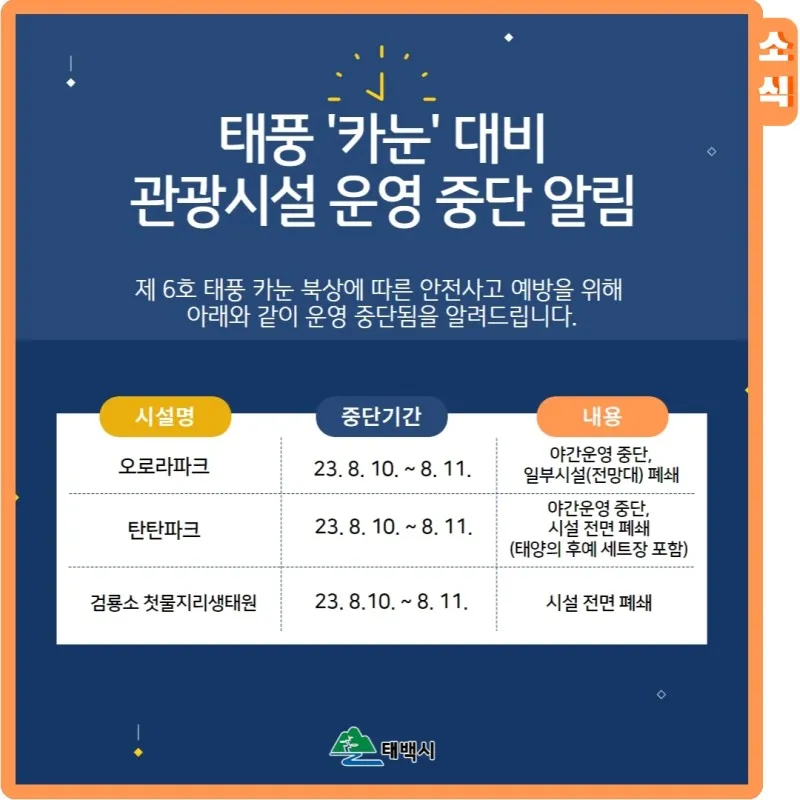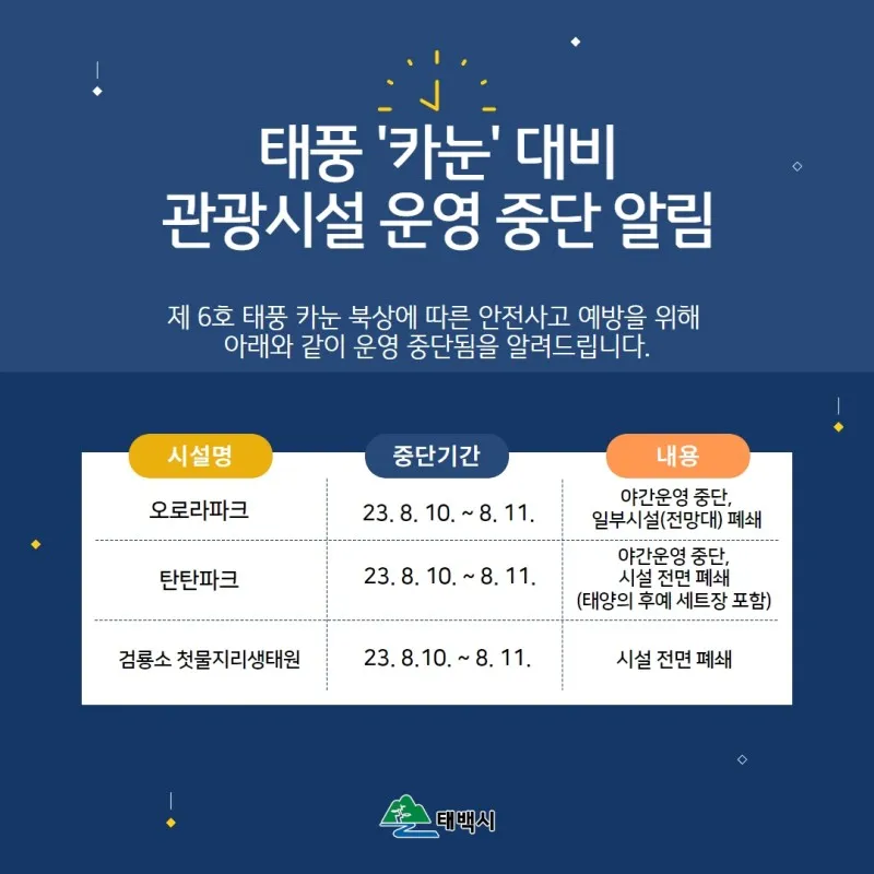 {"title":"제6호 태풍 '카눈' 대비 관광시설 운영 중단 알림","source":"https://blog.naver.com/taebaek_city/223179843330","blogName":"하이태백","blogId":"taebaek_city","domainIdOrBlogId":"taebaek_city","logNo":223179843330,"smartEditorVersion":4,"meDisplay":true,"lineDisplay":true,"outsideDisplay":true,"cafeDisplay":true,"blogDisplay":true}