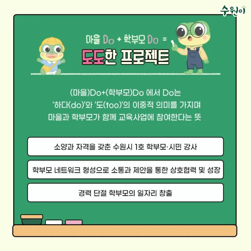 ‘도도(DODO)한 프로젝트’란 수원시 교육 브랜드 ‘청개구리 스펙’에서 활동하는 학부모 강사를 양성하는 과정입니다.