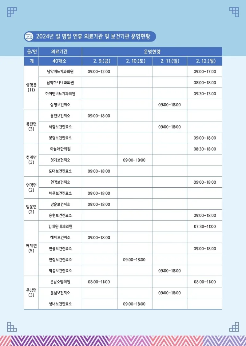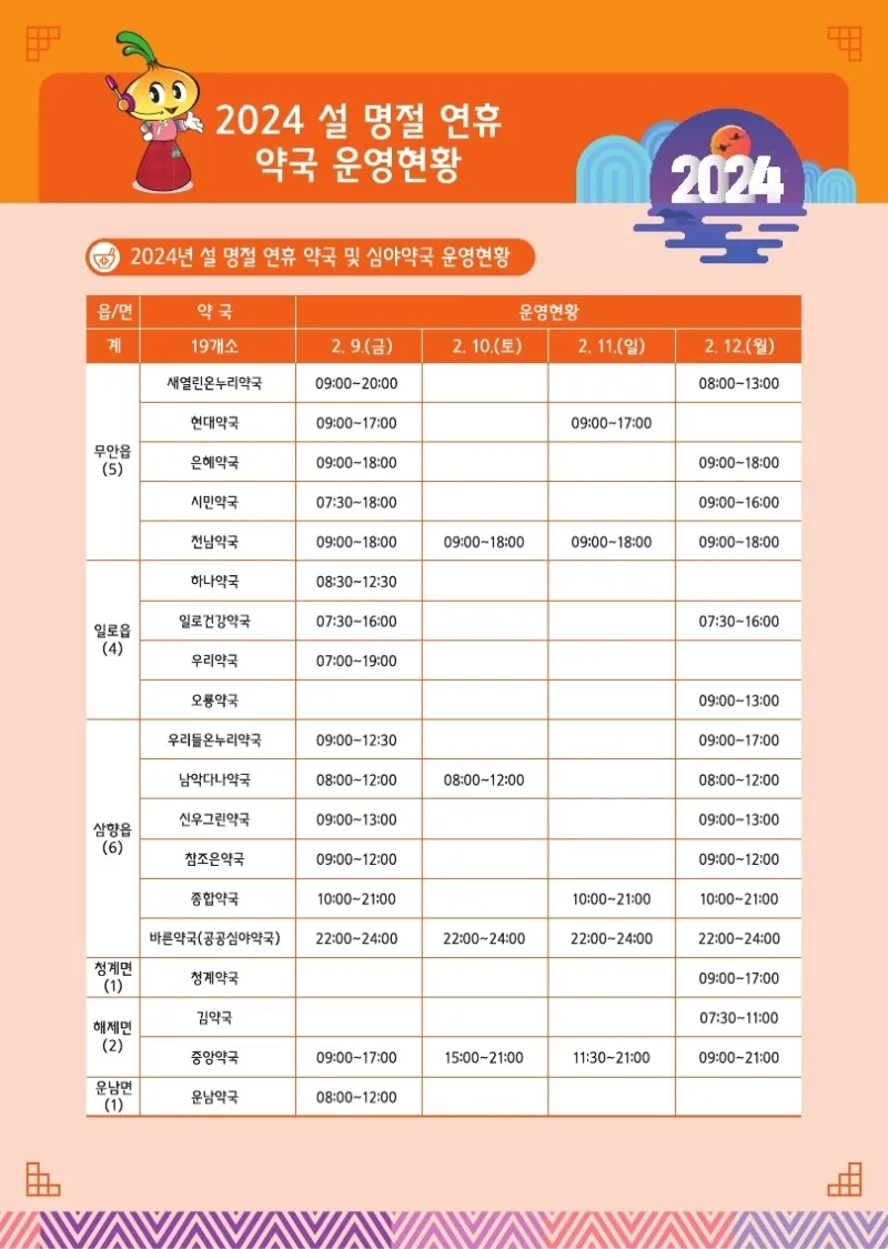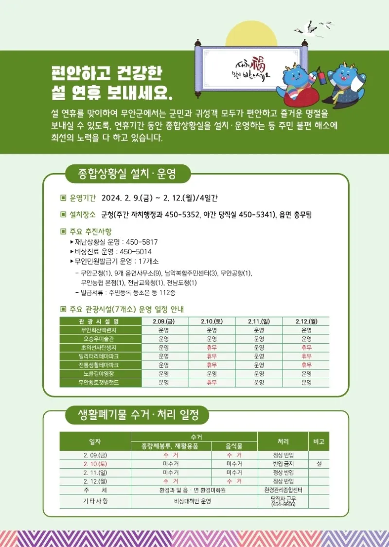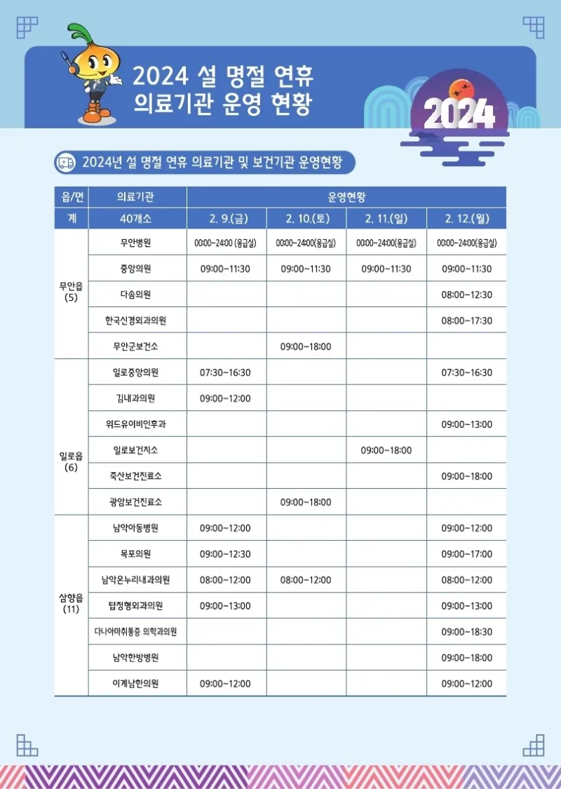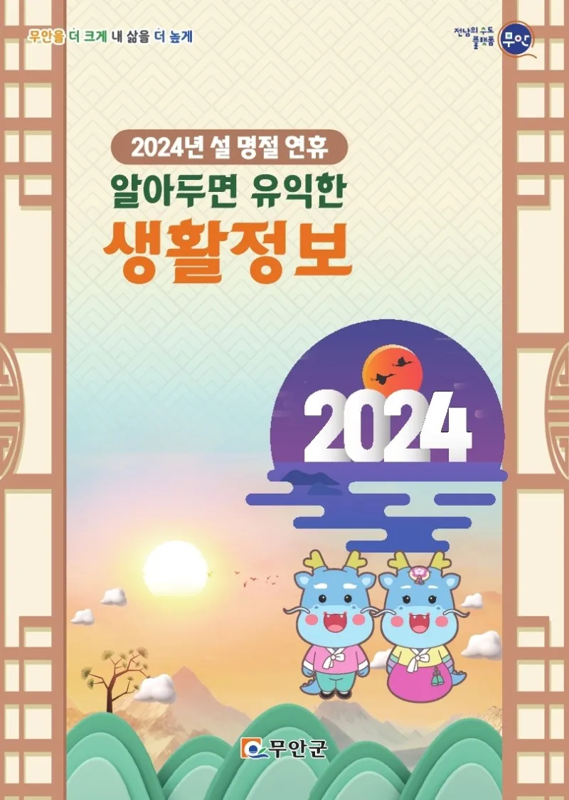 웰로2년 전2024년 설 명절 연휴! 알아두면 유익한 무안정보 이 블로그 무안소식 카테고리 글 이전 이전 다음 다음 {"title":"2024년 설 명절 연휴! 알아두면 유익한 무안정보","source":"https://blog.naver.com/muan5231/223347928915","blogName":"무안군 공..","blogId":"muan5231","domainIdOrBlogId":"muan5231","logNo":223347928915,"smartEditorVersion":4,"meDisplay":true,"lineDisplay":true,"outsideDisplay":false,"cafeDisplay":true,"blogDisplay":true} #무안군#무안#설#명절#무안사랑기부#고향#황토랑#새해#복#많이#받고#잡수고#모으고#안고#다하세요#군민여러분출처:https://blog.naver.com/muan5231스크랩