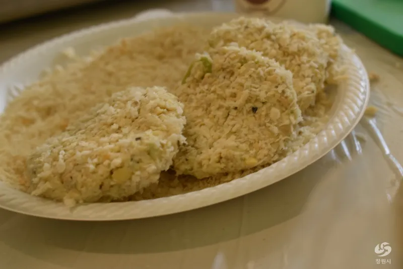 2. 대두까스(콩돈까스) ※반죽 모양을 만들고 빵가루에 묻히는 체험을 함