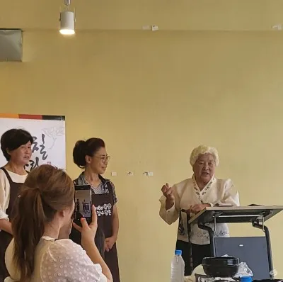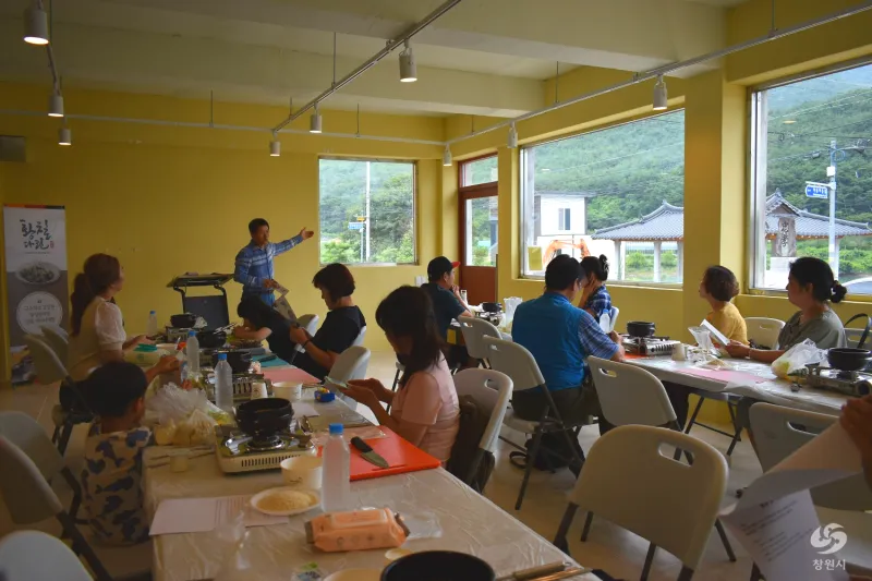 학동마을에 오래전부터 황칠나무를 심어 청국장에 황칠액을 넣어 구수하면서도 건강한 마을 명품인 황칠 청국장을 개발하고 시판하고 있다는 학동마을 제종열 이장님의 인사 말씀과 학동마을 명품 황칠청국장 명인이신 윤일년 어르신의 청국장 만드는 과정의 설명을 듣고 있습니다.