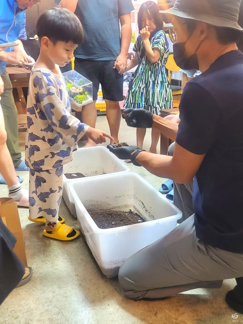 굼벵이를 직접 사육하는 방에서는 어린이들이 직접 굼벵이를 만져보는 체험을 했습니다. 장수풍뎅이와 흰점박이꽃무지 의 성장과정과 암수 구별법도 애벌레를 직접 보여주시며 친절하게 설명해 주셨습니다.