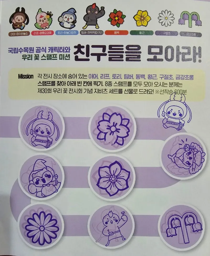 아름다운 우리 꽃과 귀여운 4총사 국립수목원 캐릭터를 찾아 스탬프를 찍는 스탬프 미션을 실행하기 위해 전시 장소를 찾아다니며 구경하니 다 찍을 수 있었다.