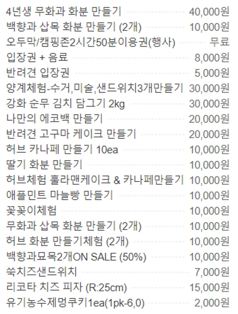 각각 체험은 신청 내용에 따라 금액이 다르므로