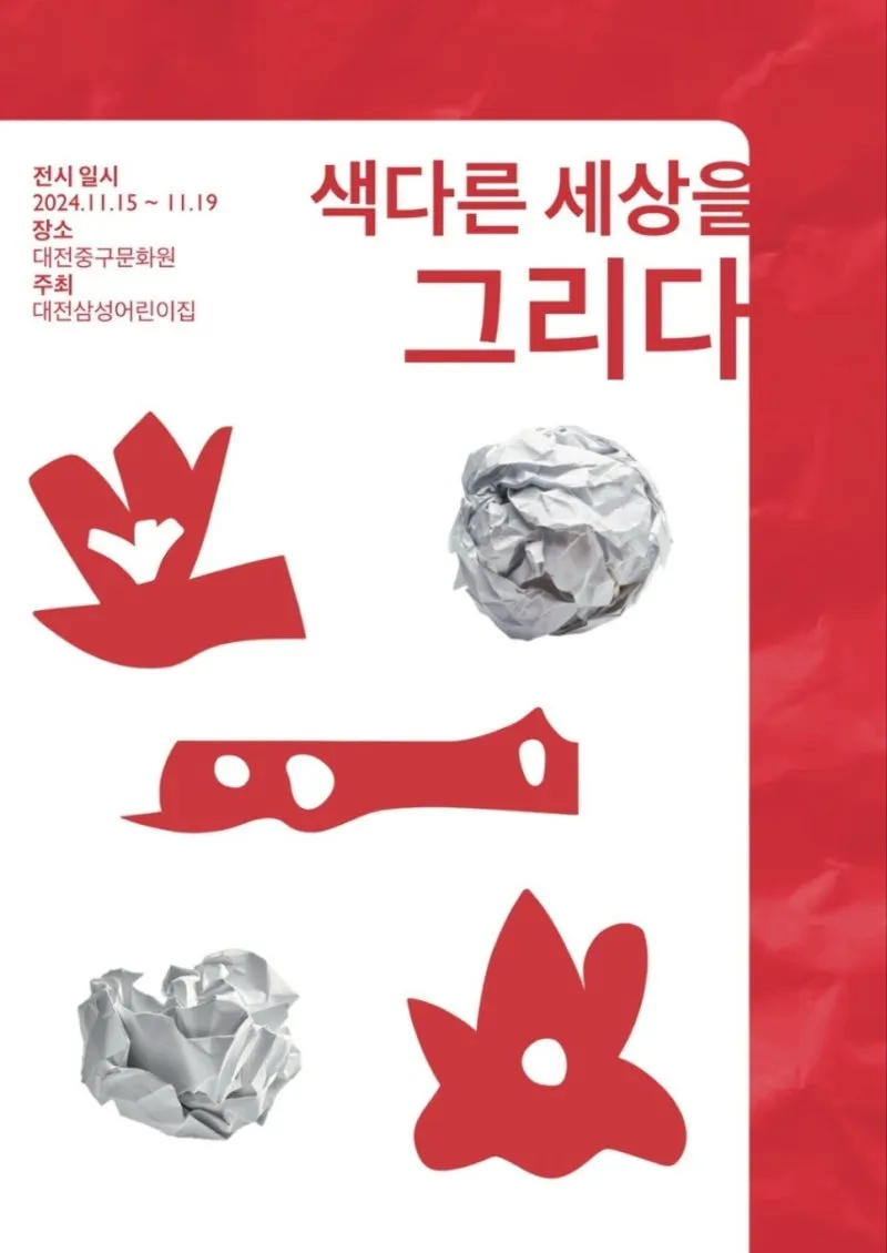 대전광역시 중구 선화동에 있는 삼성어린이집의 미술 심화 프로그램의 하나로 "색다른 세상을 그리다"라는 주제로 아이들의 작품 전시를 하고 있었습니다. 전시 기간은 2024년 11월 15일부터 11월 19일까지 5일간 진행했습니다.