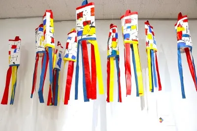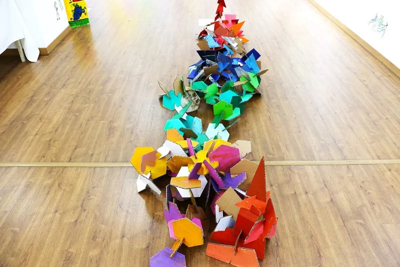 한지 그림들을 감상하며 한지를 찢으며 한지의 질감을 느껴보며 겹겹이 붙여 추상적인 표현을 하는 작품과 우리나라의 전통적인 오방색을 표현한 작품도 보입니다. 5가지 전통색의 색채를 경험해 보고 손과 눈의 협응력을 길러준답니다. 이렇듯 단순한 작품 전시가 아닌 아이들의 교육적 효과를 극대화한 전시입니다.