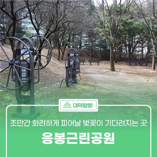 대전 대덕구 산책하기 좋은 곳 응봉근린공원은 법동에 위치하고 있으며, 맞은편에는 다양한 체육시설을 갖춘 송촌생활체육공원이 자리를 잡고 있어 산책 및 다양한 여가 활동을 즐길 수 있습니다.