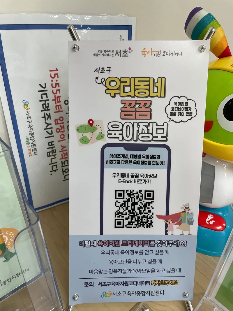 센터 소개 육아커뮤니티 아이들세상 부모세상 어린이집 유치원 9월 전문강사와 함께하는 가족놀이 안내... 08.24 [서초구육아종합지원센터] 「센터 이용 ... 08.24 9월 혜윤 오르프 뮤직 안내 08.23 [서초여성가족플라자] 서초 아빠쉐프 요리 ... 08.14 서초구육아종합지원센터 서울시 서초구 남부순환로347길 46 TEL: 02-598-9340(어린이집 문의), 9342(부모교육 및 상담), 9343(장난감도서관), 9344(시간제보육실) / FAX: 02-3471-9340 신반포 육아지원센터 서울시 서초구 신반포로19길...