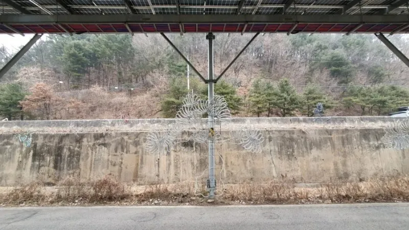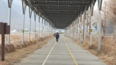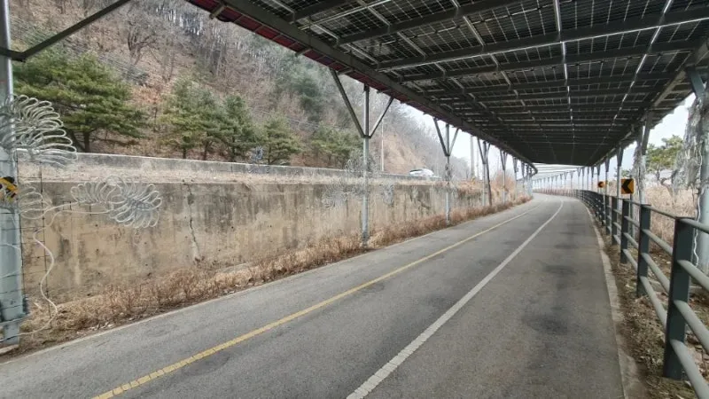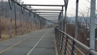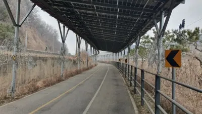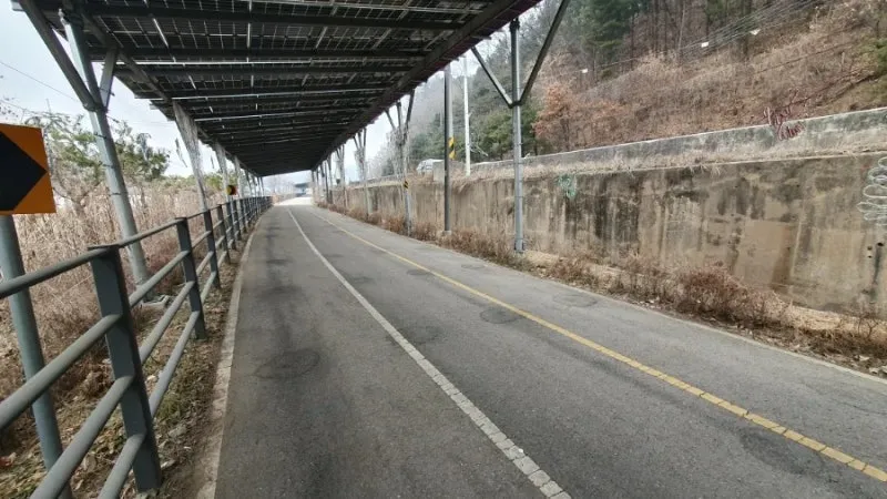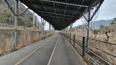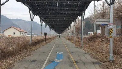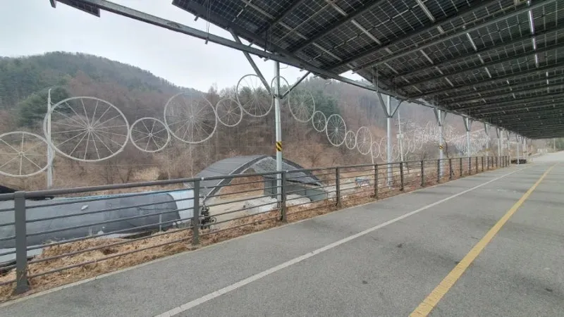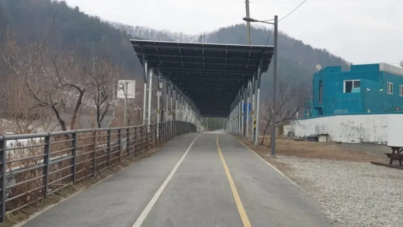 북한강 자전거길의 특징은 명칭에서도 알 수 있듯이 북한강의 경관을 구경하며 라이딩을 즐길 수 있는 특별한 자전거 코스이지만, 가평역~색현터널입구 구간은 전 구간을 통틀어 유일하게 산간내륙을 관통하는 구간으로 주변을 구경하는 재미가 조금 떨어질 수 있을지도 모릅니다. 하지만 최근에 자전거길을 따라 기나긴 태양광패널이 세워지게 되면서 의도치 않은 태양광 터널이 만들어지게 되었는데요. 라이딩을 즐기는 사람들 입장에서는 자칫 심심할 수도있는 주변풍경에 색다른 볼거리가 생겨 여행의 재미가 더해지는 듯합니다. 첫번째 태양광 패널 터널은 가평역에서 자전거로 10분 정도 떨어진 장소에서부터 시작되며, 중간중간 야간에 LED불빛이 나올 것으로 예상되는 조형물들이 많이 있어 일몰후에 방문하시면 조금 더 특별한 구경거리를 만나보실 수 있을 것으로 예상됩니다.