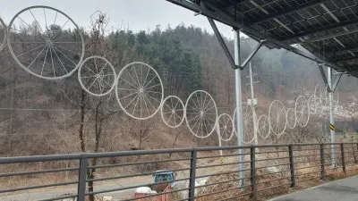 가평의 수많은 걷기길을 다녀본 저로서 한가지 아쉬운 점을 꼽자면, 중간중간 쉬었다갈 수 있는 쉼터들은 많지만 음료나 간식을 사먹을 수 있는 곳은 시내구간을 관통하는 루트 외에는 찾아볼 수 없다는 점인데, 이곳에는 북한강 자전거길 바로 옆에 편의점이 붙어있어 미리 챙기지 못한 물과 간식등을 바로 구매할 수 있었습니다(해당 장소는 색현터널에 다다르기 전에 위치한 곳으로 특별히 위치를 언급해드리지 않아도 길가에 곧바로 보이기 때문에 쉽게 찾아가실 수 있습니다.). 해당 편의점이 위치한 곳에서 두번째 태양광 패널 터널이 시작되며, 자전거길에 조성된 태양광발전시설이라 그런지 자전거바퀴를 이용한 조형물들이 중간중간에 설치되어 있기에 이를 구경하는 재미도 있었습니다. 이번 포스팅에서 알려드린 북한강 자전거길은 가평관내구간 중 40%에 해당되며 나머지 60%는 색현터널~상천리~청평시내~대성리 구간이나 이곳은 벚꽃이 피어나는 봄에 방문하셔야 굉장히 아름답기에 벚꽃이 피어나기 시작하는 4월초에 다시 안내해드리도록 하겠습니다. 내용과 관련하여 궁금한 점이 있으신 분들은 아래의 댓글창을 이용하여 문의해주시길 바랍니다.