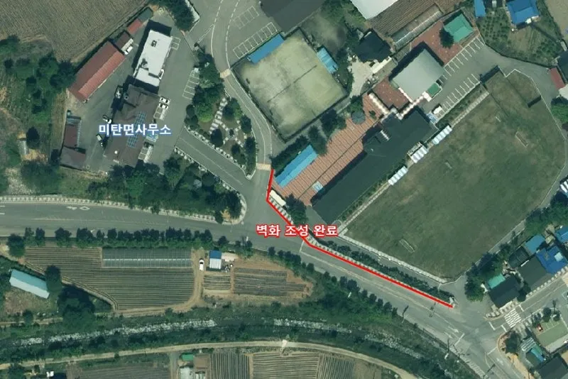 📍미탄중학교 방음벽은 면사무소 입구에 자리해 청옥산 육백마지기를 찾는 차량이 반드시 지나치는 길목으로, 그동안 지역 이미지를 대표하는 관문 역할을 해왔습니다. 하지만 표면이 고르지 못한 방음벽 특성상 도색이 어렵고, 기존 도색 제거 또한 까다로워 사업 추진에 어려움이 있었습니다.