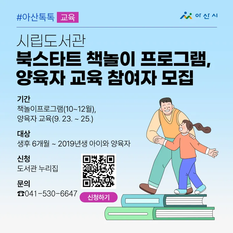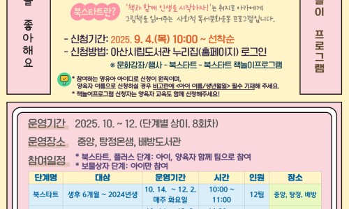 책놀이 프로그램 home 문화행사/강좌 북스타트 책놀이프로그램 2025년 아산시립도서관 북스타트 책놀이 프로그램 & 양육자 교육 안내 작성일 2025-09-01 13:28:52 작성자 시립도서관 조회 126 2025년 아산시립도서관 하반기 북스타트 책놀이 프로그램 참여자를 모집합니다. 북스타트(BOOKSTART) 책놀이 프로그램이란? "책과 함께 인생을 시작하자"라는 취지로 북스타트 자원활동가 선생님이 영유아에게 그림책을 읽어주고, 영유아와 양육자가 그림책을 매개로 풍요로운 관계를 형성할 수 있도록 돕는 지역사회 독서...