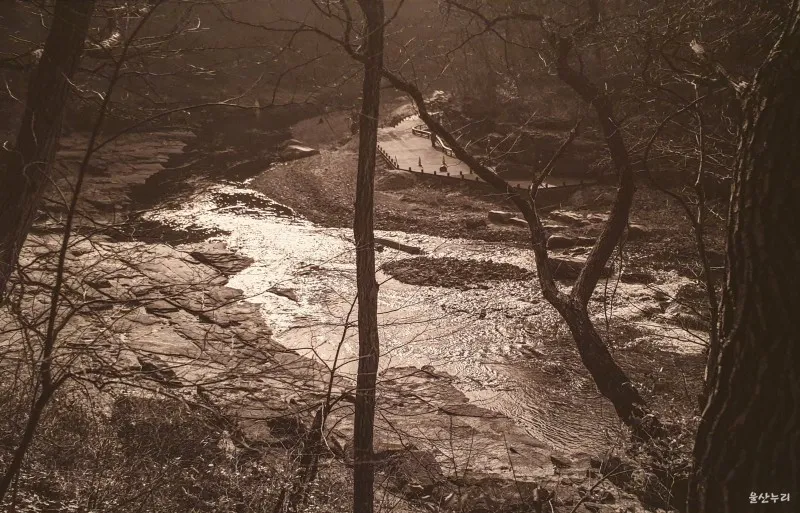 반구대 상류에 있는 선사부터 신라까지 시대상을 종합한 국보 제147호 천전리 각석 앞 대곡천 사진입니다. 신라의 명문이 있기 때문에 각석이라 부릅니다. 55년 전 X-mas 이브 날, 선물처럼 발견된 각석 사진이 신성한 제단 같습니다.