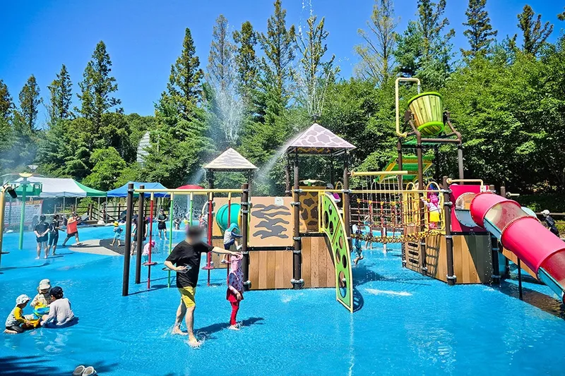 더운 날씨에 다양한 물놀이시설에서 물이 뿜어져 나오고 있어 옆에는 보는 것만으로도 시원하게 느껴지는 것 같고, 바닥이 파란색으로 되어있어 더욱 시원해 보이는 것 같습니다.