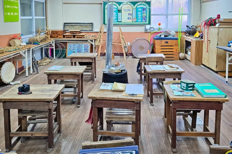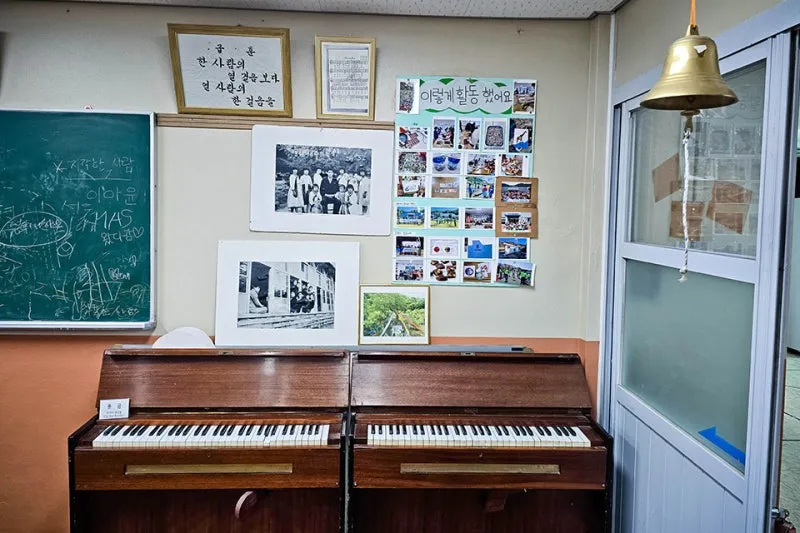 옛날 흑백사진과 풍금까지 있으니 정말 과거 초등학교 교실을 떠올리게 하는데요, 옛날에는 교실이 넓고 책상과 의자가 큰 거 같았는데 지금 보니 너무 작게 느껴집니다.