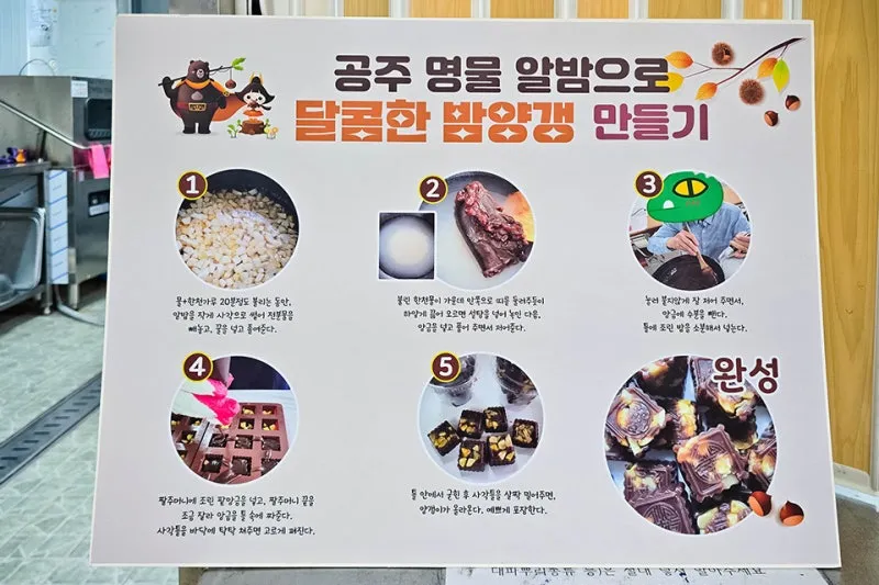 오늘은 달콤한 밤양갱 만들기 체험을 할 예정인데요, 먼저 밤양갱 만들기 체험에 대한 자세한 내용을 이렇게 쉽게 그림으로 알려주고 있습니다.