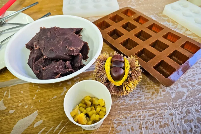 물과 한천가루를 20분간 불리는 동안 테이블에는 앙금과 작게 썬 알밤, 그리고 사각 틀과 밤 모양의 틀이 있었는데요,