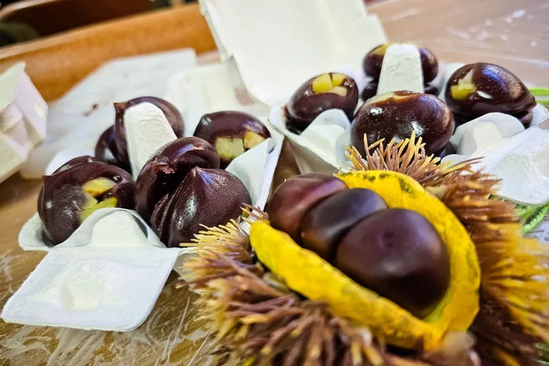 한천과 앙금을 넣고 풀어주면서 저어준 후 틀에 조린 밤을 소분해서 넣고 판 주머니에 조림 팥앙금을 넣고 만들면 이렇게 밤 모양의 밤양갱이 완성됩니다. 밤양갱에 밤이 들어가 있고 모양까지 알밤 모양이라 예쁘고 맛있었습니다.