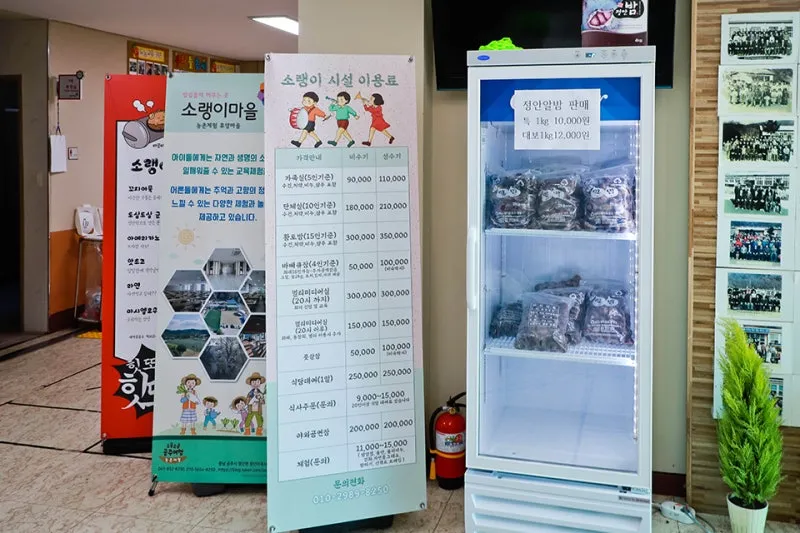 안으로 들어가면 가장 먼저 정안 알밤 판매와 소랭이시설 이용료와 이곳에서 할 수 있는 다양한 체험도 안내하고 있습니다.
