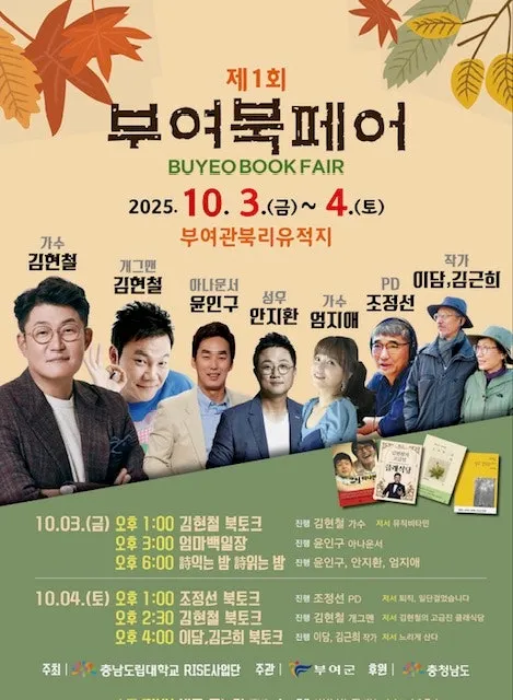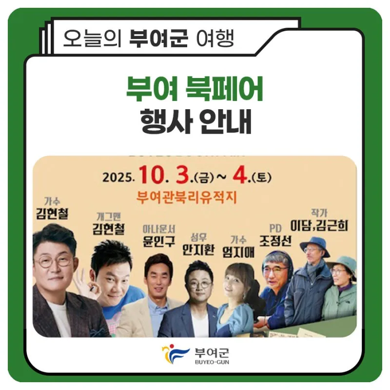 웰로69일 전제1회 부여 북페어 📚제1회 부여 북페어 📆행사기간 2025. 10. 3.(금) ~ 10. 4.(토) 🚙장소 부여군 시내 관북리 유적지 내 🔎행사내용 가수 김현철, 아나운서 윤인구, 성우 안지환, 가수 엄지애, PD 조정선, 개그맨 김현철, 이담/김근희 부부 등이 참석하는 북토크 / 엄마 백일장 등 📞문의 041-830-3965 #부여북페어 #북토크 #김현철 #윤인구 #북콘서트 #부여축제 #부여가볼만한곳 #부여여행 #부여 #부여군 #부여행사 {"title":"📚제1회 부여 북페어","source":"https://blog.naver.com/buyeoblog/224025793138","blogName":"부여군청","domainIdOrBlogId":"buyeoblog","nicknameOrBlogId":"부여군청","logNo":224025793138,"smartEditorVersion":4,"blogDisplay":true,"outsideDisplay":true,"meDisplay":true,"lineDisplay":true,"cafeDisplay":true} #부여북페어#북토크#김현철#윤인구#북콘서트#부여축제#부여가볼만한곳#부여여행#부여#부여군#부여행사출처:https://blog.naver.com/buyeoblog스크랩