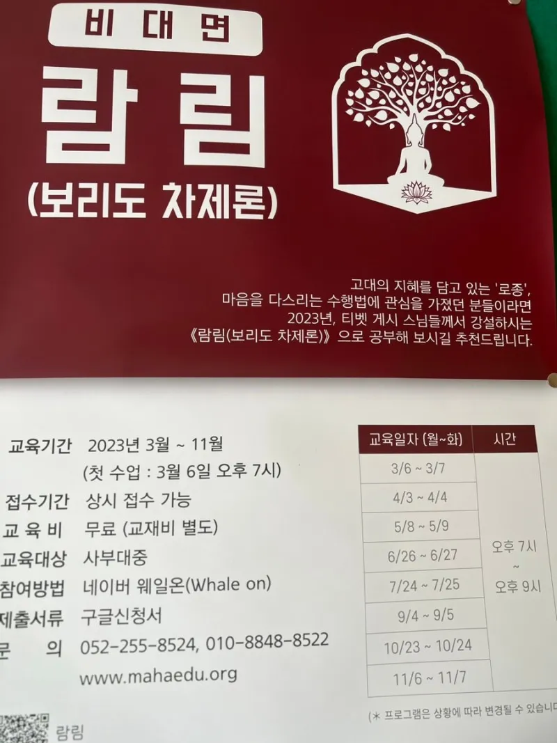 무료 교육 일정도 있더라고요. 종교가 불교이시거나 불교에 관심 있는 분들은 한번 티베트 스님의 불교 무료수업도 있으니 참고하시길 바랍니다.