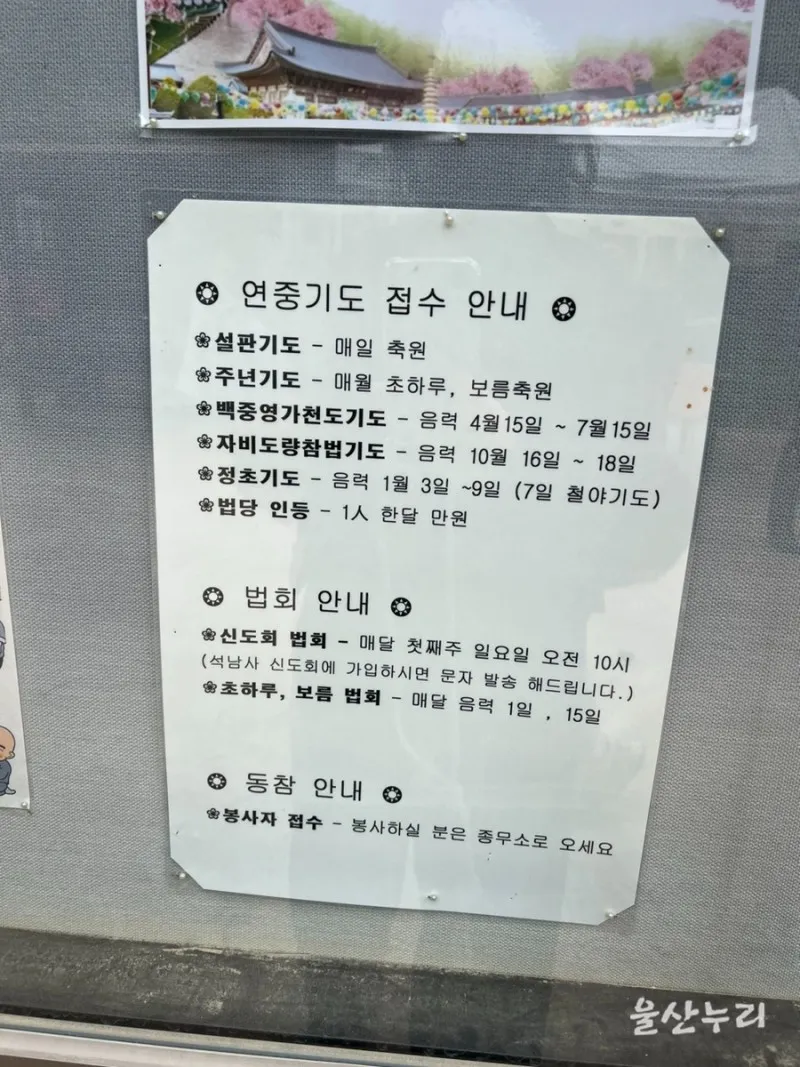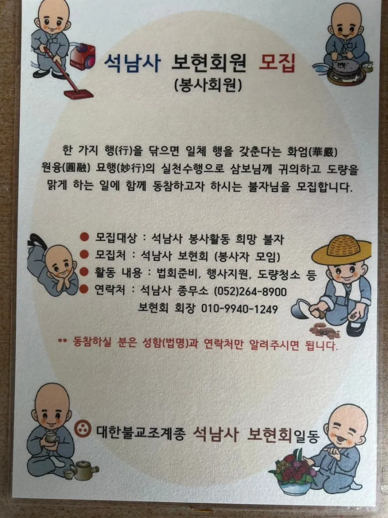 석남사 봉사 회원을 모집합니다. 스님들을 위해 법회 준비하고 청소하고 행사지원하기도 한다고 하네요. 스님과 가까이할 수 있는 기회가 없는데 불자가 되어 스님의 수행을 가까이서 볼 수 있는 기회가 아닐까 싶어요. (자세한 건 문의 )