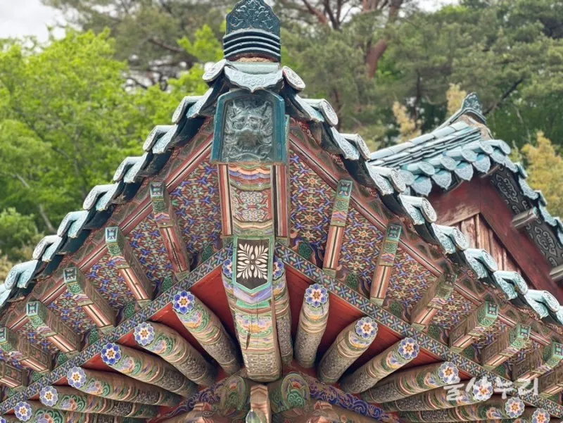 절은 보고 있으면 연한 청색과 분홍색. 녹색의 조화가 절의 분위기를 안정적으로 유지해 주는 기분이 듭니다. 저도 한참을 바라보았어요. 절 만큼 평화로운 공간은 없는 거 같아요 석남사 대웅전 지붕에는 용의 장식물이 얹어져 있어요. 내림마루와 추녀마루 각각 한 개씩 있는데 흑기와와 청기와의 조화로움도 함께 볼 수 있었어요.