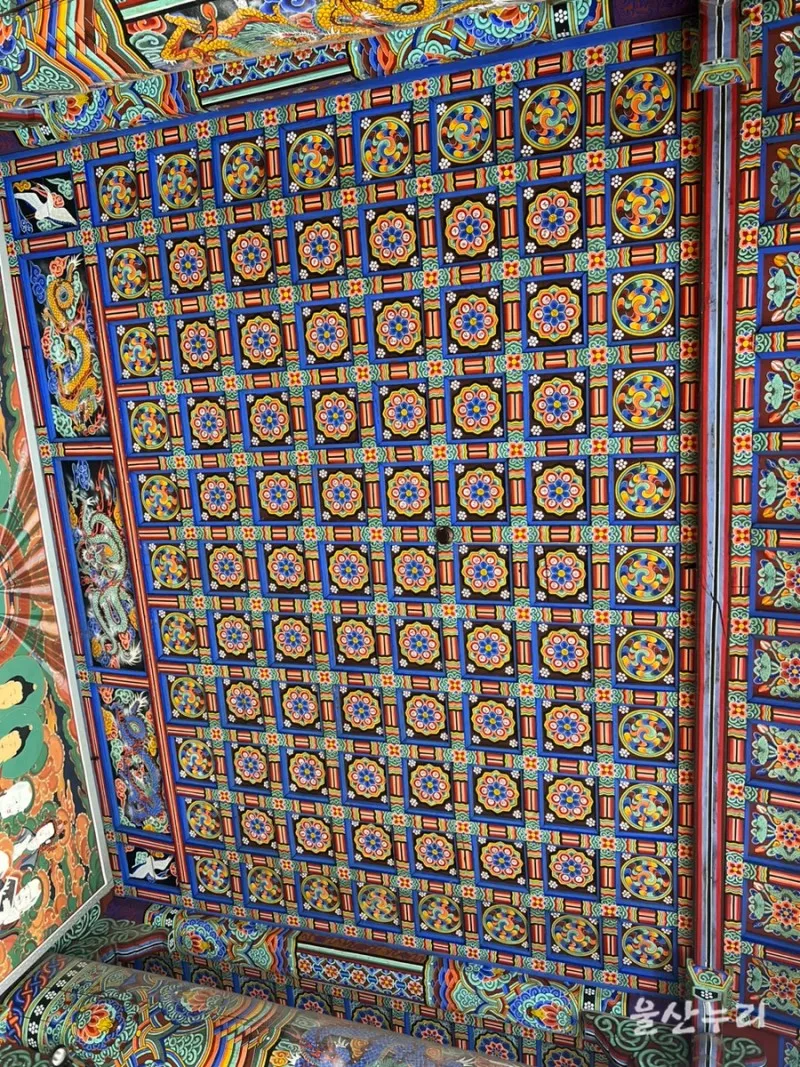 절 내부에 들어가자마자 제일 먼저 천장이 눈에 들어왔어요. 붉은색 노란색 검은색 등으로 이루어진 연화들이 그려져 있었어요. 그리고 그 주변은 4마리의 용과 구름이 그 주위를 빙빙 돌고 있는 그림이 그려져있었어요.