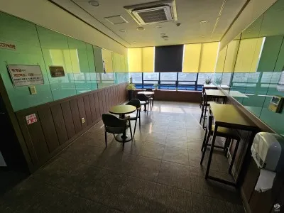 마지막으로 6층으로 한번 올라가 봅니다. 6층에는 다목적실/강당과 휴게실 공간이 있습니다. 휴게실은 오른편에 간단하게 테이블과 의자가 있으며 개인학습을 하다가 점심이나 저녁에 간단하게 먹 거리를 준비해오시면 여기 휴게실 공간을 이용하여 즐길 수 있습니다.