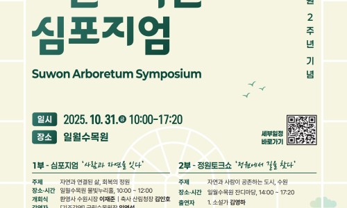 <img alt="수원특례시 . 사람과 자연을 잇다 2025 수원수목원 심포지엄 Suwon Arboretum Symposium 수원수목원 수원 수목원 개원 2주년 기념 일시 2025.10.31. 10:00-17:20 장소 일월수목원 세부일정 바로가기 1부- 심포지엄 '사람과 자연을 잇다' 2부- 정원토크쇼 '정원에서 길을 찾다' 주제 자연과 연결된 삶, 회복의 정원 주제 장소·시간 개회식 일월수목원 물빛누리홀, 10:00 ~ 12:00 환영사 수원시장 이재준 축사 산림청장 김인호 장소·시간 출연자 강연자 [기조강연] 국립수...