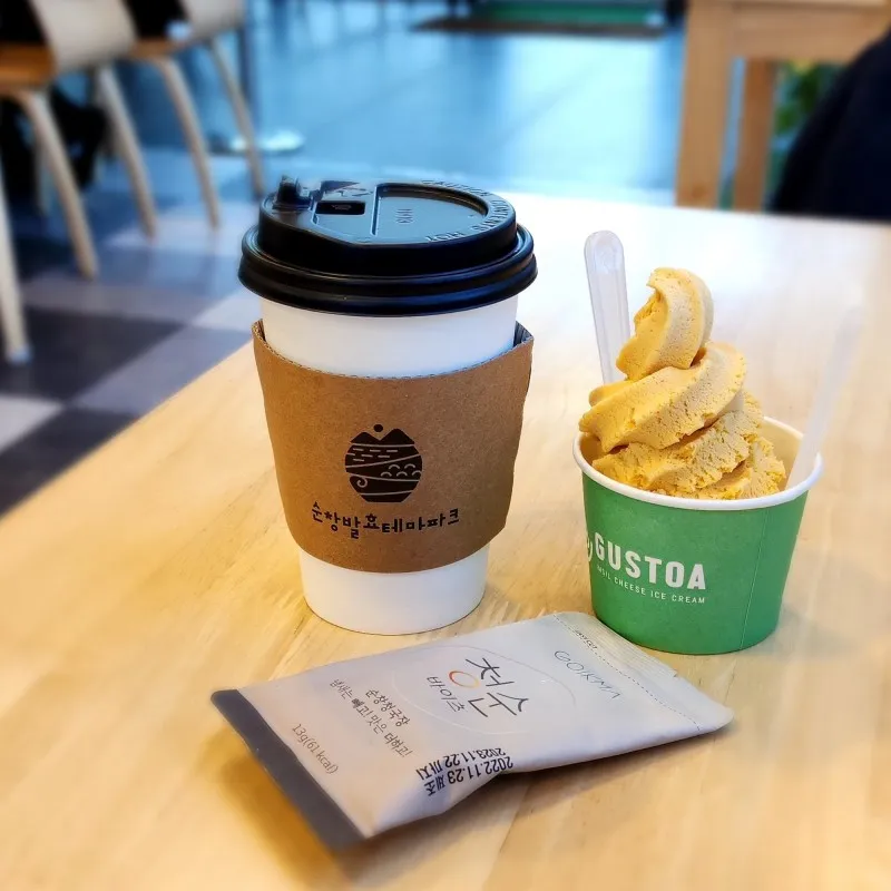 뜨거운 아메리카노 한 잔에 된장 아이스크림 그리고 토핑으로 올려 먹기 위해 청순 바이츠 하나 주문했어요.