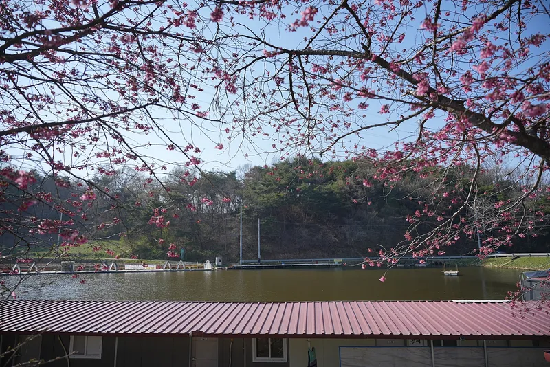 잔잔한 저수지 물결 위로도 핑크빛 꽃잎들이 떨어져 떠다닙니다. 물가는 고요하여 꽃잎이 수면에 비치는 모습이 한 폭의 수채화처럼 느껴집니다.