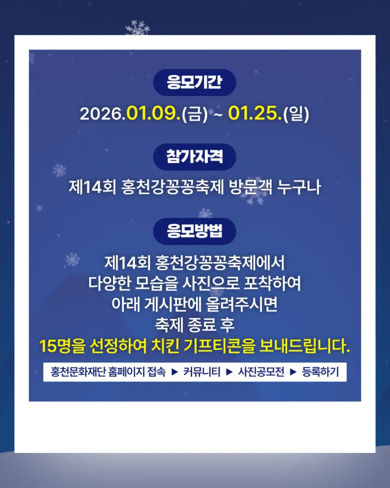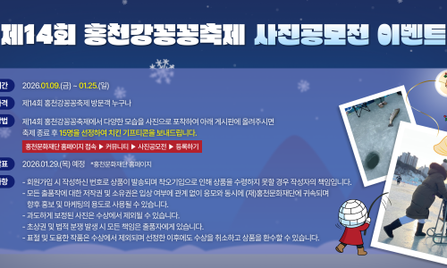 제14회 홍천강꽁꽁축제장에서 다양한 모습을 사진으로 포착하여 아래 게시판에 올려주시면 축제 종료 후 15명을 선정하여 치킨 기프티콘을 보내드립니다.