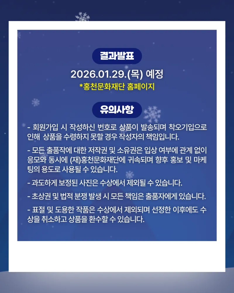 ✔️모든 출품작에 대한 저작권 및 소유권은 입상 여부에 관계 없이 응모와 동시에 (재)홍천문화재단에 귀속되며 향후 홍보 및 마케팅의 용도로 사용될 수 있습니다.