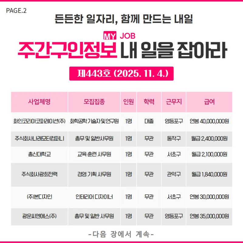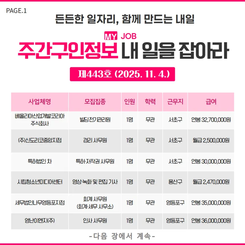 주간구인정보 내 일을 JOB아라 제443호 (2025.11.4.)