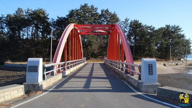 이름이 게 섬이며 여기에 빨간 다리가 놓여 있는데 게 섬 다리입니다.