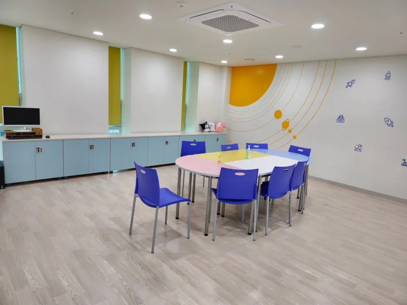 상담에 참여할 수 있는 다채로운 색상의 놀이실이 있습니다.