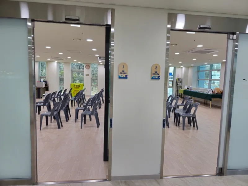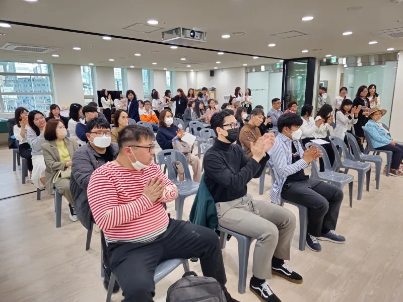 센터 내부 2층으로 이동하여 사업보고 및 영상시청, 기관 라운딩이 예정되어 있습니다.